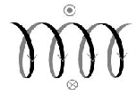 The picture on the right (adapted from www.astro.uva.nl/cp/) is an artist's perception of an AGN with helical magnetic field lines, the illustration on the left shows how a helical magnetic field can be explained by observing a transverse RM gradient. The cross shows the magnetic field component away from the observer, and the circle shows the magnetic field component pointed directly at the observer. The changing line-of-sight magnetic field component explains the transverse RM gradient that is observed.