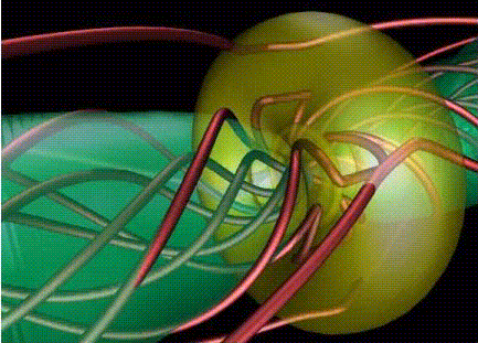 Right: Illustration showing how the magnetic field lines from a magnetic tower model (with the magnetic field lines going in the direction of outflow, finally looping back down to the accretion disk) can get wound up as an "inner" and "outer" helix (representing the opposing gradients in the RM maps as shown in the image above), as a result of the differential disk rotation. The first figure shows the direction of the magnetic field lines in this model, whereas the second follows the path of one of these magnetic field lines that gets wound up in a "nested helical field".