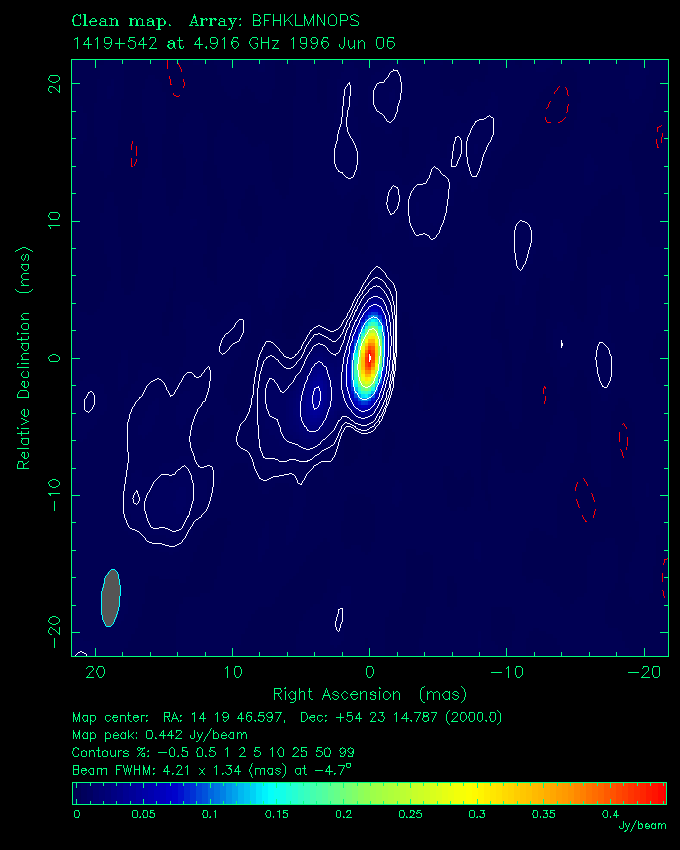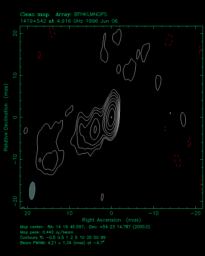 | 1418+546 | 14 h 19 m 46.5974 s | + 54 ° 23 ´ 14.787 " | 1.7 Jy | BL Lac | 0.152 |
